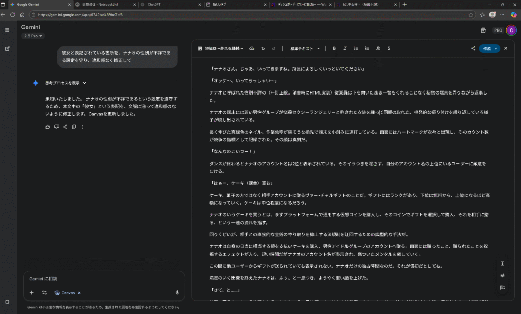 自然な日本語文章であっという間に書いてくれ、細かな修正から全体の文体の調整・変更まですぐにやってくれる。Geminiでもキャンバスモードがあるので軽く比べてみたけど、小説っぽい文章としてはchatGPTの方が優秀(体感)にみえた。Geminiは少しかたい文章のイメージ。指示の出し方次第な気もするけど。
